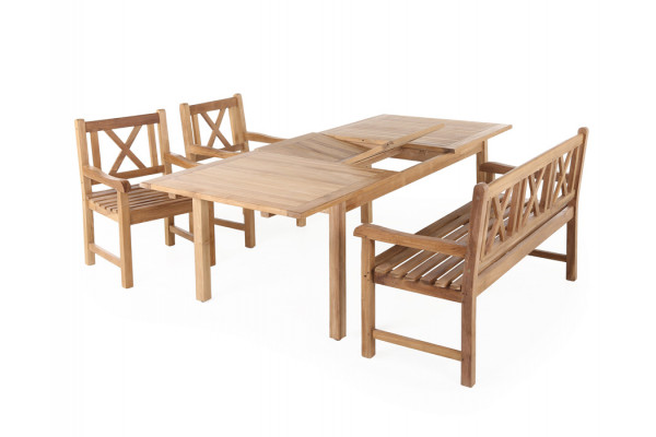 Sættet består af 3-personers bænk, 2 stole samt flot udtræksbord. Alt i massiv kerne teaktræ.