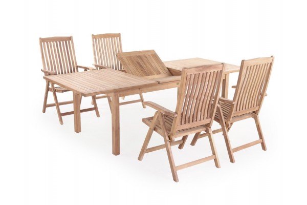 Virkelig flot sæt bestående af 4 stk. Devon positionsstole samt Alsa udtræksbord. Fremstillet i massiv kerne teaktræ i den allerbedste kvalitet.