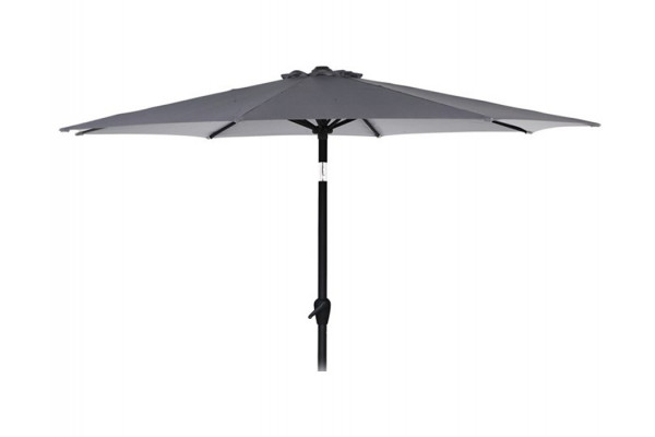 3 meter parasol med håndsving samt tilt. Sort aluminium med grå polyester dug. 2-delt stok. Drej håndtaget MED uret, for at slå parasollen op
