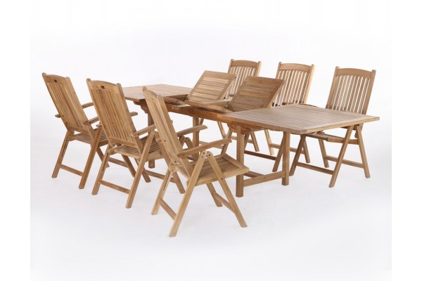 Sæt bestående af 6 stk. Madrid positionsstole og stort Anna udtræksbord med 2 udtræksplader. Fremstillet i superflot kerne teaktræ.