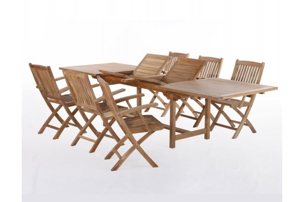 Sættet består af 6 stk. Mia foldestole med armlæn og stort Anna udtræksbord med 2 udtræksplader. Fremstillet i superflot kerne teaktræ.