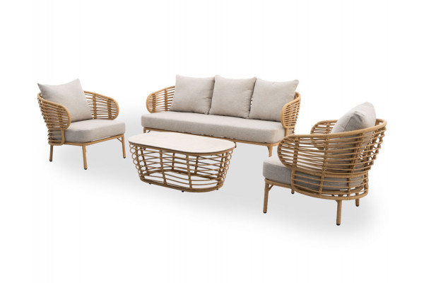 Sættet består af en rummelig 3-personers sofa, to matchende loungestole og et elegant sofabord.
