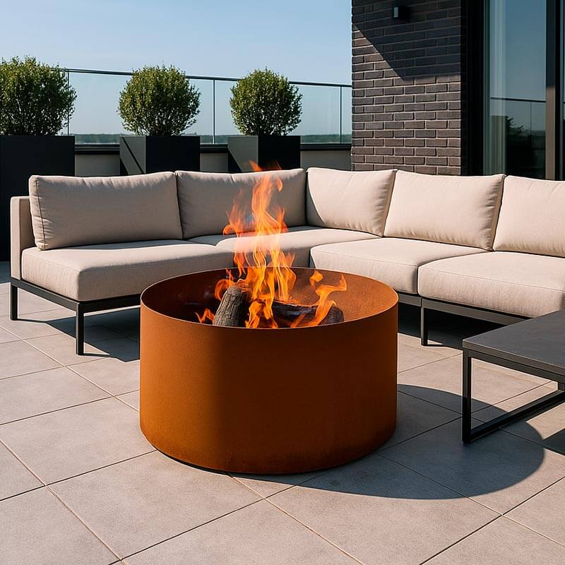 Et rundt bålsted som dette er både praktisk og utrolig smukt. Cortenstålet får hurtigt det et rustent udseende, men gennemtærer ikke ligesom almindelig jern.