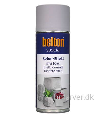 Belton Beton Effekt. Højkvalitets betoneffektspray for at opnå et dekorativt betonlook. Specialsprayen kan bruges inde og ude, direkte på mange overflader. Den konkrete effekt giver de malede genstande et  massivt Beton  udseende. Overmal ikke med klarl