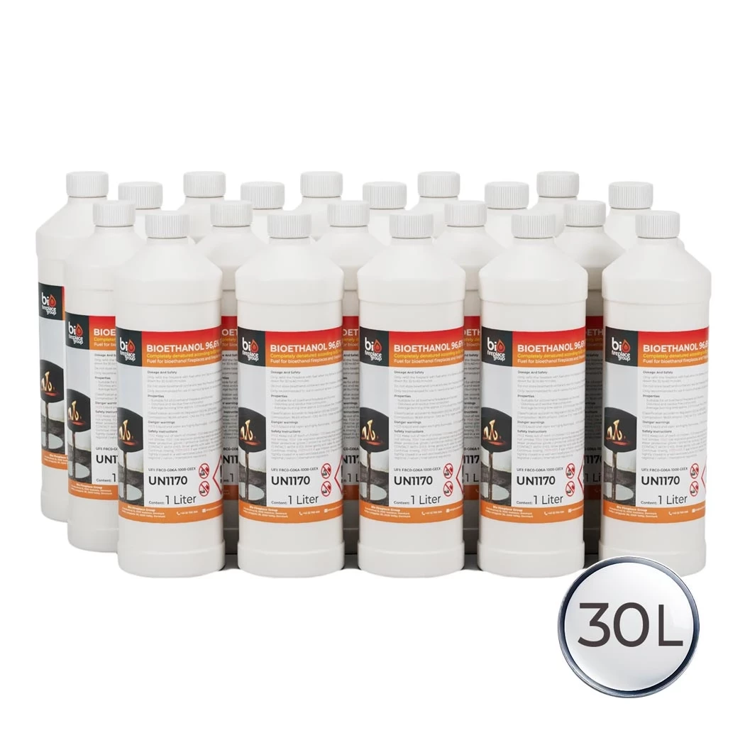 30 x 1 liter bioethanol i flasker. 96,6 % ethanol til biopejse i høj kvalitet.