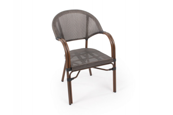 Stabelstol med stel i aluminium og ryg og sæde i brun textiline.