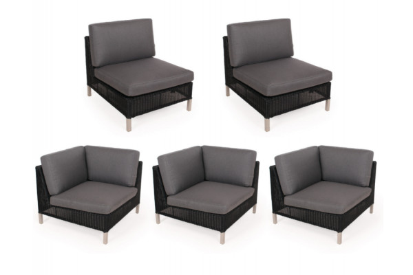 Modulsæt bestående af 3 Connect hjørnemoduler og 2 Connect mellem-moduler. Modulerne er i farven sort og hynder er i farven grå.