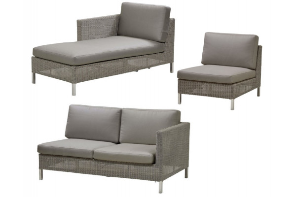 Loungesæt bestående af Connect 2 pers. sofa, mellemmodul samt chaiselongmodul. Moduler og hynder er i farven Taupe.