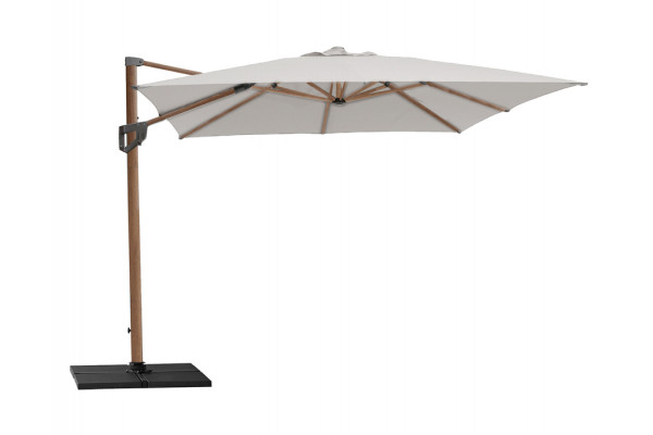 Superlækker Hyde hængeparasol med stel i aluminium med folie med trælook. Dugen er fremstillet af langtidsholdbart og UV-resistent materiale i farven Dusty white.