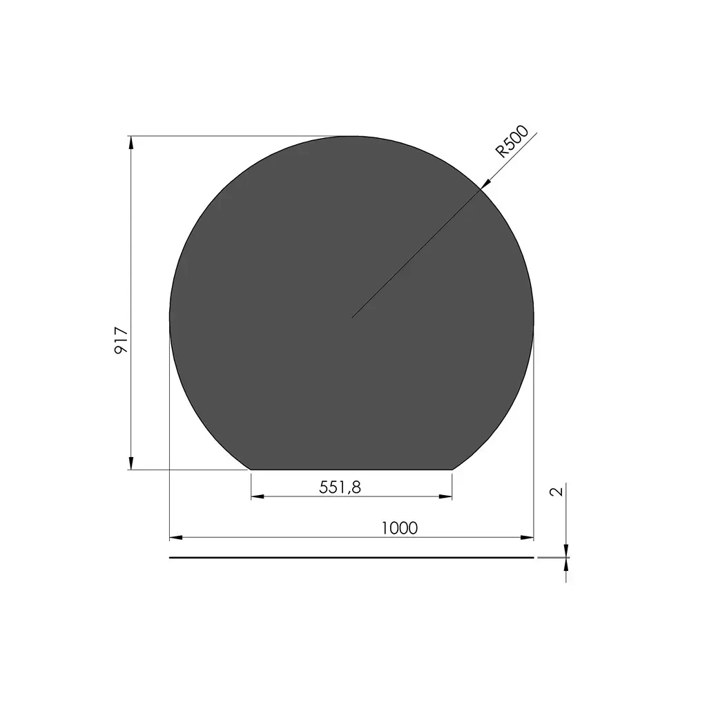 Denne runde gulvplade måler 100 x 91,7 cm. Gulvpladen er en praktisk og stilfuld beskyttelse til gulvet omkring din pejs. Fremstillet af slidstærkt materiale, beskytter den mod varme, aske og spild. Selvom det ikke er en nødvendighed til biopejse, så giv