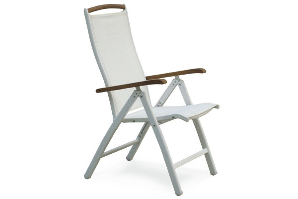 Positionsstol i hvid aluminium med kraftig hvid textiline-flet på sæde og ryg. Med lækker teak på armlæn og øverst på ryggen.