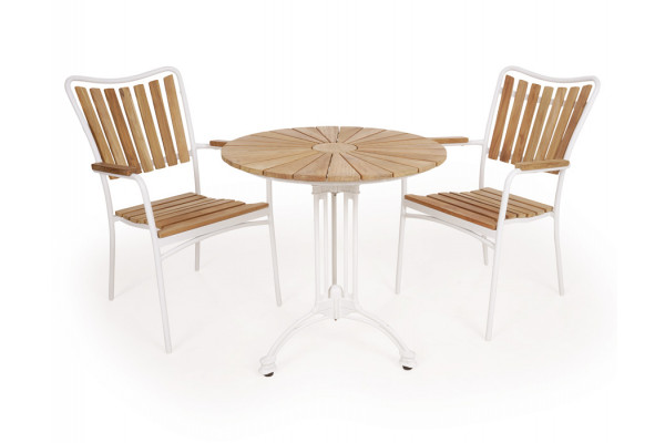 Superflot og elegant sæt med cafébord sammen med 2 stole. Alt fremstillet i pulverlakeret hvidt aluminiumsstel og med flot FLEGT- eller FSC-certificeret kerne teaktræ.