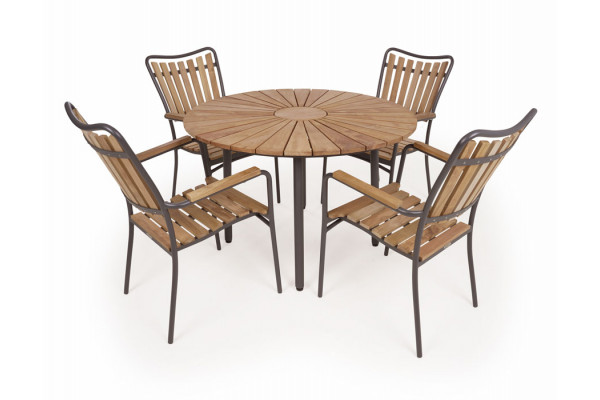 Superflot og elegant sæt med rundt bord sammen med 4 stole. Alt fremstillet i pulverlakeret antracitgråt aluminiumsstel og med flot kerne teaktræ. FLEGT-certificeringen sikrer, at teaktræet er både lovligt og bæredygtigt