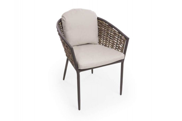 Havestol i kraftig naturfarvet polyrattanflet og med stel i koksgrå aluminium.