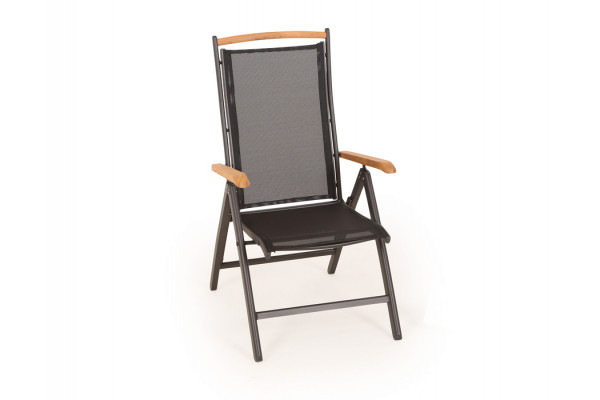 Positionsstol i antracitgrå aluminium med kraftig textiline-flet på sæde og ryg. Med lækker kerneteak på armlæn og øverst på ryggen.