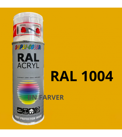 * Pris og information for varen Dupli Color RAL 1004 er opdateret med information modtaget fra BNFarver.dk den december 20, 2025. Vi tager forbehold for afvigelser, prisændringer og eventuelle fejl i det her anførte og de faktiske forhold hos forhandleren af produktet – Se mere info her. Bemærk også, at denne side indeholder kommercielle/sponsorerede links.