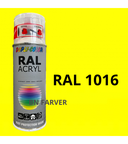 * Pris og information for varen Dupli Color RAL 1016 er opdateret med information modtaget fra BNFarver.dk den december 20, 2025. Vi tager forbehold for afvigelser, prisændringer og eventuelle fejl i det her anførte og de faktiske forhold hos forhandleren af produktet – Se mere info her. Bemærk også, at denne side indeholder kommercielle/sponsorerede links.