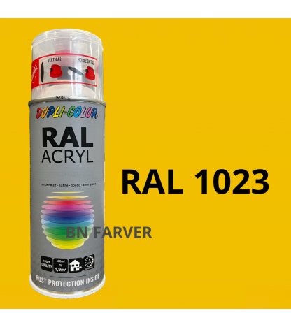* Pris og information for varen Dupli Color RAL 1023 er opdateret med information modtaget fra BNFarver.dk den december 20, 2025. Vi tager forbehold for afvigelser, prisændringer og eventuelle fejl i det her anførte og de faktiske forhold hos forhandleren af produktet – Se mere info her. Bemærk også, at denne side indeholder kommercielle/sponsorerede links.