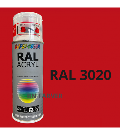* Pris og information for varen Dupli Color RAL 3020 er opdateret med information modtaget fra BNFarver.dk den december 20, 2025. Vi tager forbehold for afvigelser, prisændringer og eventuelle fejl i det her anførte og de faktiske forhold hos forhandleren af produktet – Se mere info her. Bemærk også, at denne side indeholder kommercielle/sponsorerede links.