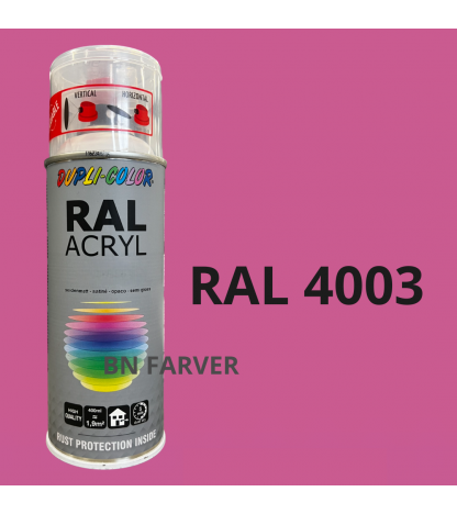 * Pris og information for varen Dupli Color RAL 4003 er opdateret med information modtaget fra BNFarver.dk den december 20, 2025. Vi tager forbehold for afvigelser, prisændringer og eventuelle fejl i det her anførte og de faktiske forhold hos forhandleren af produktet – Se mere info her. Bemærk også, at denne side indeholder kommercielle/sponsorerede links.