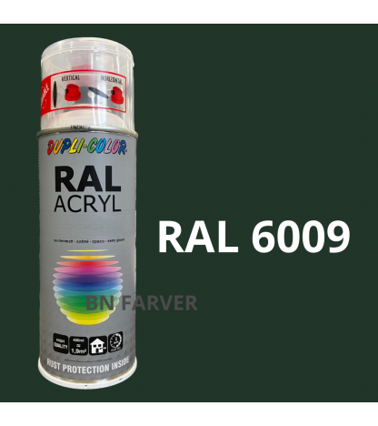 * Pris og information for varen Dupli Color RAL 6009 er opdateret med information modtaget fra BNFarver.dk den december 28, 2025. Vi tager forbehold for afvigelser, prisændringer og eventuelle fejl i det her anførte og de faktiske forhold hos forhandleren af produktet – Se mere info her. Bemærk også, at denne side indeholder kommercielle/sponsorerede links.