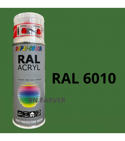 * Pris og information for varen Dupli Color RAL 6010 er opdateret med information modtaget fra BNFarver.dk den december 28, 2025. Vi tager forbehold for afvigelser, prisændringer og eventuelle fejl i det her anførte og de faktiske forhold hos forhandleren af produktet – Se mere info her. Bemærk også, at denne side indeholder kommercielle/sponsorerede links.