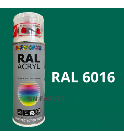 * Pris og information for varen Dupli Color RAL 6016 er opdateret med information modtaget fra BNFarver.dk den december 28, 2025. Vi tager forbehold for afvigelser, prisændringer og eventuelle fejl i det her anførte og de faktiske forhold hos forhandleren af produktet – Se mere info her. Bemærk også, at denne side indeholder kommercielle/sponsorerede links.