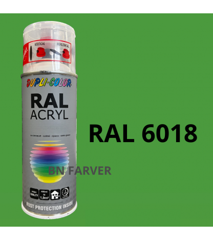 * Pris og information for varen Dupli Color RAL 6018 er opdateret med information modtaget fra BNFarver.dk den december 28, 2025. Vi tager forbehold for afvigelser, prisændringer og eventuelle fejl i det her anførte og de faktiske forhold hos forhandleren af produktet – Se mere info her. Bemærk også, at denne side indeholder kommercielle/sponsorerede links.