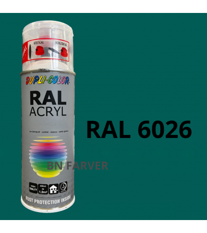 * Pris og information for varen Dupli Color RAL 6026 er opdateret med information modtaget fra BNFarver.dk den december 28, 2025. Vi tager forbehold for afvigelser, prisændringer og eventuelle fejl i det her anførte og de faktiske forhold hos forhandleren af produktet – Se mere info her. Bemærk også, at denne side indeholder kommercielle/sponsorerede links.