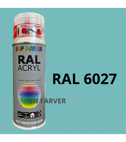 * Pris og information for varen Dupli Color RAL 6027 er opdateret med information modtaget fra BNFarver.dk den december 28, 2025. Vi tager forbehold for afvigelser, prisændringer og eventuelle fejl i det her anførte og de faktiske forhold hos forhandleren af produktet – Se mere info her. Bemærk også, at denne side indeholder kommercielle/sponsorerede links.
