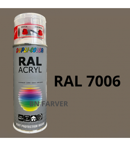 * Pris og information for varen Dupli Color RAL 7006 er opdateret med information modtaget fra BNFarver.dk den december 28, 2025. Vi tager forbehold for afvigelser, prisændringer og eventuelle fejl i det her anførte og de faktiske forhold hos forhandleren af produktet – Se mere info her. Bemærk også, at denne side indeholder kommercielle/sponsorerede links.