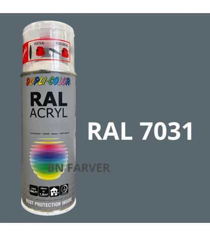 * Pris og information for varen Dupli Color RAL 7031 er opdateret med information modtaget fra BNFarver.dk den december 28, 2025. Vi tager forbehold for afvigelser, prisændringer og eventuelle fejl i det her anførte og de faktiske forhold hos forhandleren af produktet – Se mere info her. Bemærk også, at denne side indeholder kommercielle/sponsorerede links.
