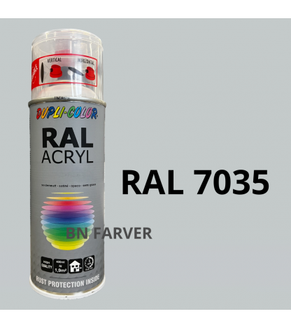 * Pris og information for varen Dupli Color RAL 7035 er opdateret med information modtaget fra BNFarver.dk den december 28, 2025. Vi tager forbehold for afvigelser, prisændringer og eventuelle fejl i det her anførte og de faktiske forhold hos forhandleren af produktet – Se mere info her. Bemærk også, at denne side indeholder kommercielle/sponsorerede links.