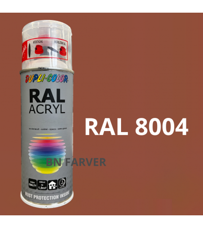 * Pris og information for varen Dupli Color RAL 8004 er opdateret med information modtaget fra BNFarver.dk den december 28, 2025. Vi tager forbehold for afvigelser, prisændringer og eventuelle fejl i det her anførte og de faktiske forhold hos forhandleren af produktet – Se mere info her. Bemærk også, at denne side indeholder kommercielle/sponsorerede links.