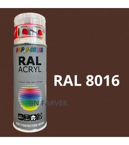 * Pris og information for varen Dupli Color RAL 8016 er opdateret med information modtaget fra BNFarver.dk den december 28, 2025. Vi tager forbehold for afvigelser, prisændringer og eventuelle fejl i det her anførte og de faktiske forhold hos forhandleren af produktet – Se mere info her. Bemærk også, at denne side indeholder kommercielle/sponsorerede links.