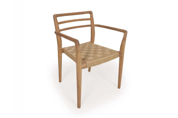 Fremstillet i lækker kerneteak. Stolen har et flot håndflettet sæde i polyrattan der er UV-bestandigt, nemt at rengøre, miljøvenligt og 100% genanvendeligt.