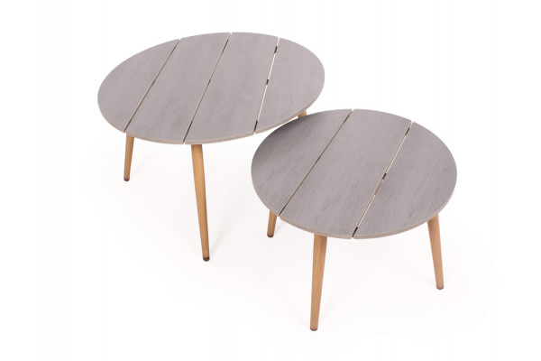 Sæt med 2 runde borde. Med ben i aluminium med træ-look og bordplade i grå nonwood.