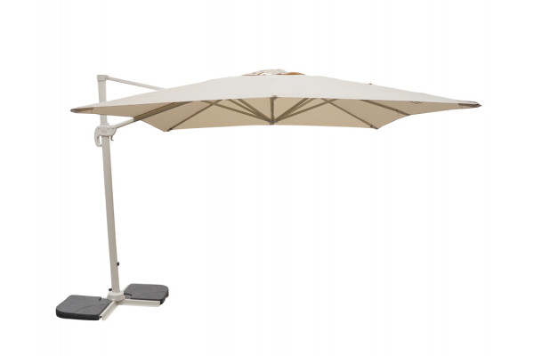 Hængeparasol med krydsfod og smart drejesokkel. Stellet er i farven gråhvid og selve dugen er i naturfarvet polyester.