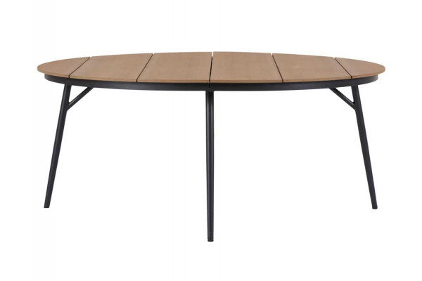 Flot rundt bord med bordplade i nonwood med trælook. Stellet er i sort aluminium.