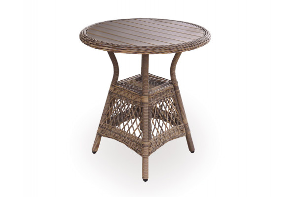 Elegant cafébord med stel i kraftig brun polyrattan-flet samt bordplade i flot nonwood.