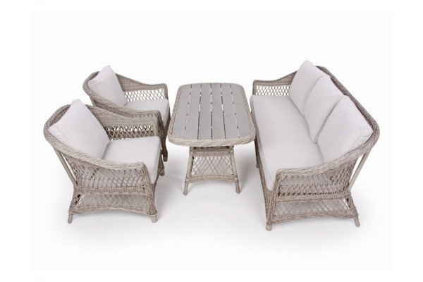 Super lækkert sofasæt. 1 sofa, 2 sofastole og 1 bord med lysegrå nonwood-lameller. Alt i elegant kraftig lysegrå polyrattan-flet.
