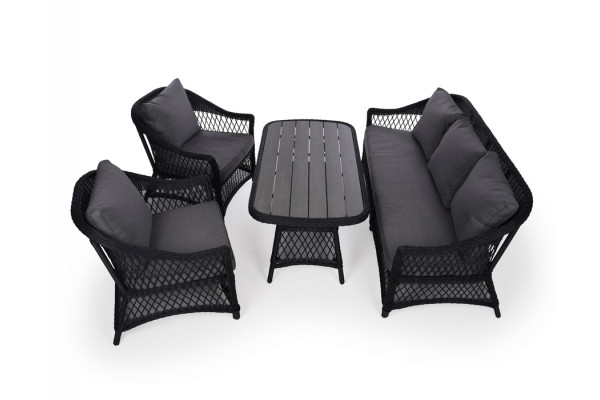 Super lækkert sofasæt. Sættet er med sofa, to sofastole og bord med lysegrå nonwood-lameller. Alt i elegant kraftig sort polyrattan-flet.