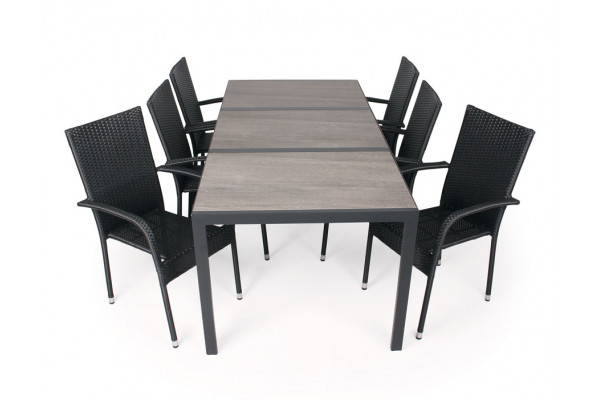 Flot sæt med 6 stk. Geneve Stabelstol med stålstel og sort polyrattanflet samt Fanø bord med stel i aluminium og 3 plader i grå keramik.