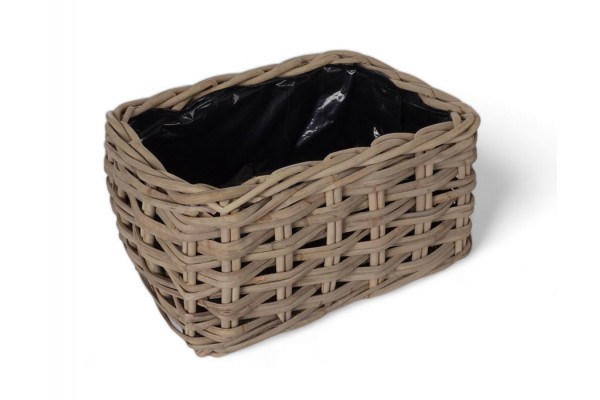 Firkantet kurv i håndflettet Kubu naturrattan. Beklædt med sort plast indvendig.
