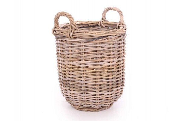 Rund kurv i håndflettet naturrattan. Med håndtag.