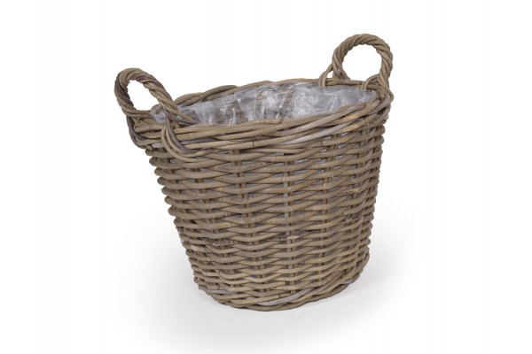 Rund kurv i håndflettet naturrattan. Med håndtag. Beklædt med plast indvendig.