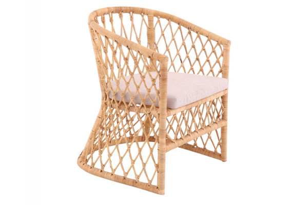 Elegant loungestol fremstillet i håndflettet i natur-rattan. Stolen leveres med naturfarvet hynde. Passer fint på den overdækkede terrasse eller i udestuen.