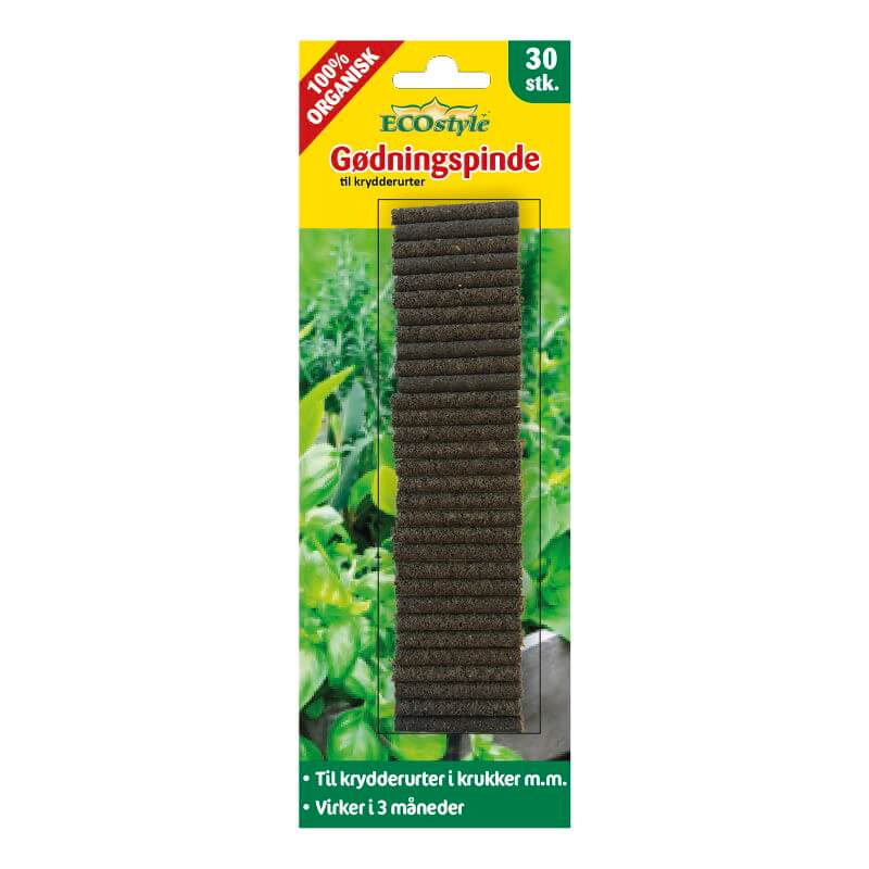 * Pris og information for varen Gødningspinde til krydderurter, 30 stk – ECOstyle er opdateret med information modtaget fra Havehandel.dk den marts 14, 2026. Vi tager forbehold for afvigelser, prisændringer og eventuelle fejl i det her anførte og de faktiske forhold hos forhandleren af produktet – Se mere info her. Bemærk også, at denne side indeholder kommercielle/sponsorerede links.