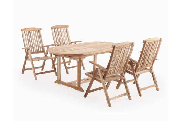 Sættet består af fire komfortable Granada positionsstole med justerbar ryg, der giver optimal siddekomfort ved både afslapning og spisning. Det tilhørende ovale Malaga udt