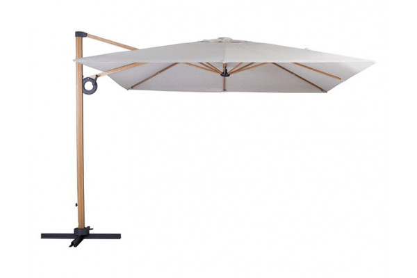Hængeparasol med krydsfod og smart 360 drejesokkel. Kraftig dug i sandfarvet polyester. Hængeparasollen har stok og lameller i aluminium i flot trælook.